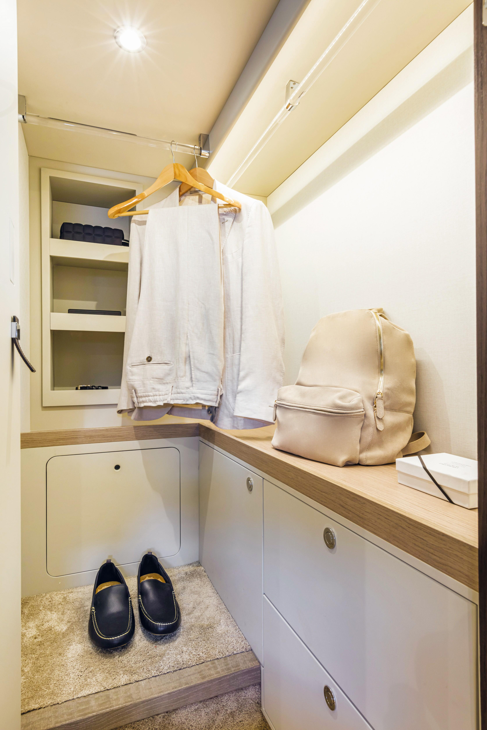 On the lower deck you can find three wide cabins for a total of 6 beds: a central cabin with single beds, a VIP cabin with a huge walk-in wardrobe and the bow master cabin, in a raised position above the floatation level, with “en suite” toilet equipped with a porthole in the shower to ensure the natural ventilation, a vanity corner, large wardrobes and furnishing with an harmonious stylistic line.The use of all spaces is even eased thanks to the fine sliding doors.