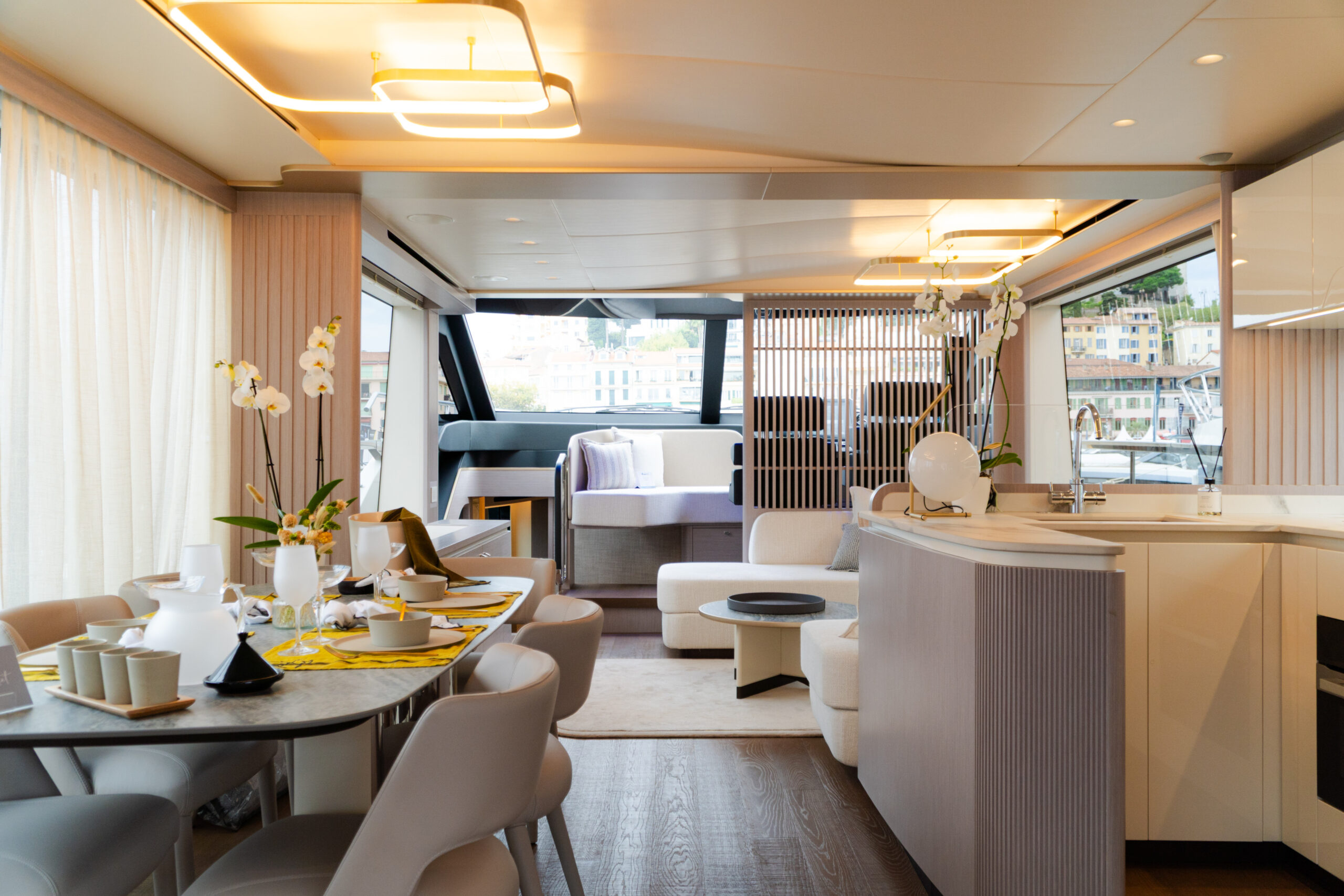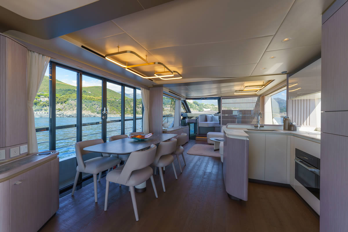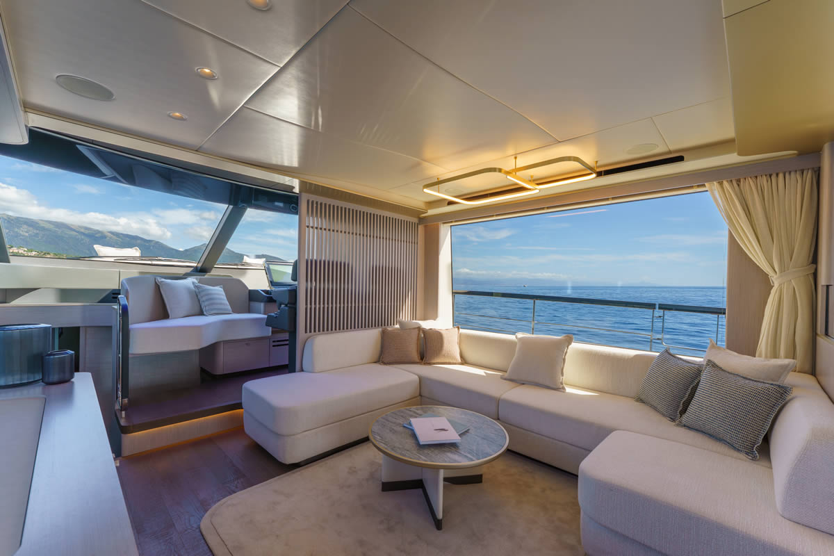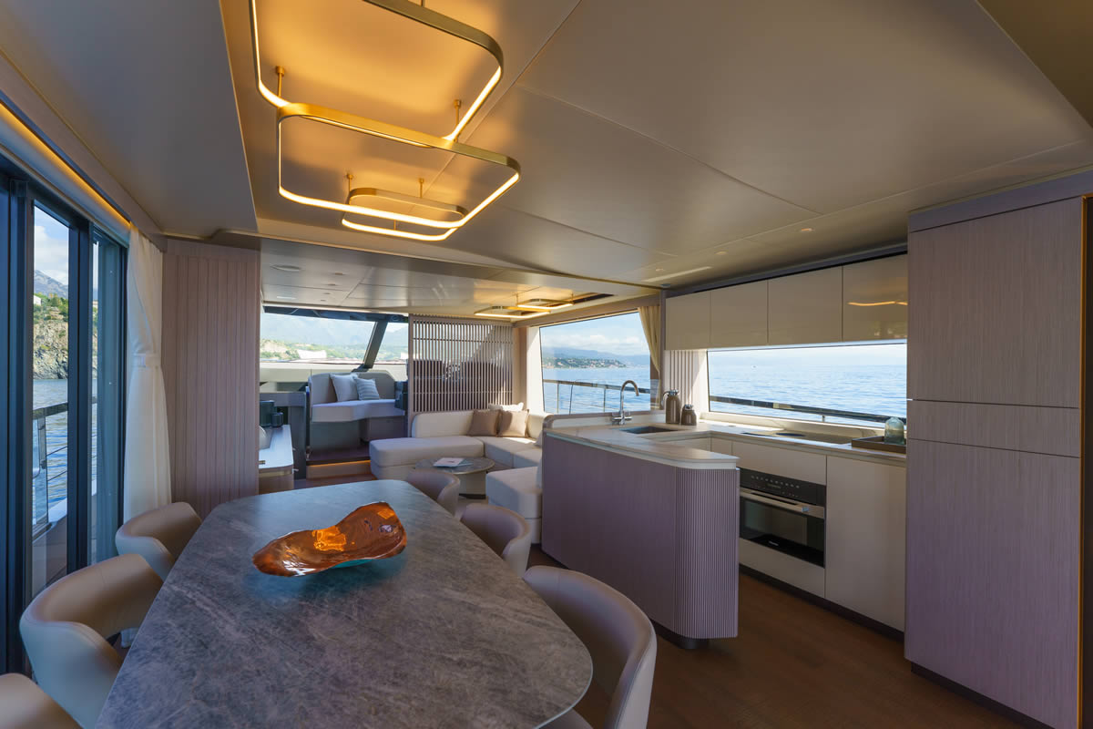 The design of the 70 FLY dissolves the boundaries between interior and exterior, offering a fully immersive experience in the surrounding environment. One of the most innovative features is the sliding door on the port side, made up of six panels, which transforms the indoor dining area into an almost open-air space, where the sea breeze and the view of the sea become an integral part of the onboard comfort.