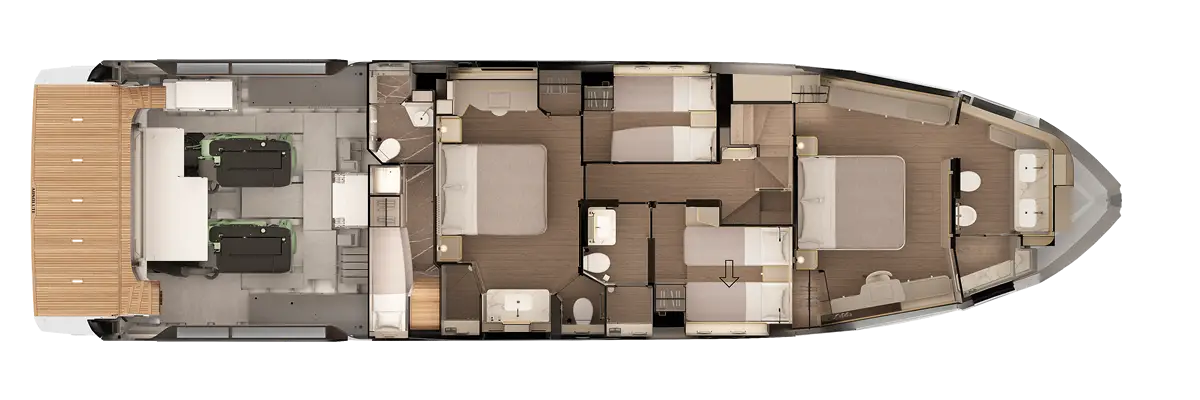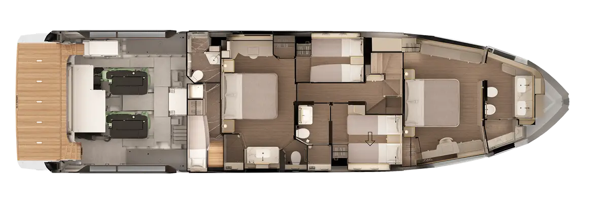 The four cabins, including the master forward with a king-size bed and the aft VIP cabin, guarantee unparalleled comfort, with spaces designed for maximum relaxation. Each cabin is equipped with elegant furnishings, en-suite bathrooms, and smart solutions such as the electrically sliding bed in the guest cabin. Additionally, the crew cabin, with separate access and a private bathroom, ensures smooth onboard management, making every journey a luxurious and practical experience.