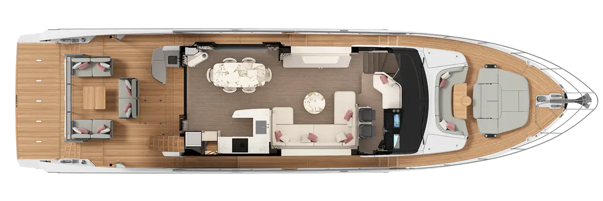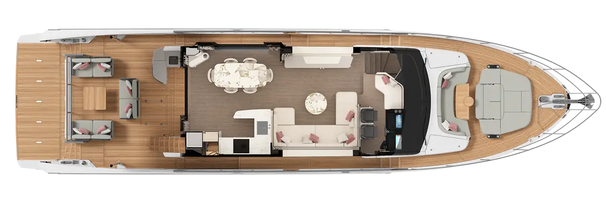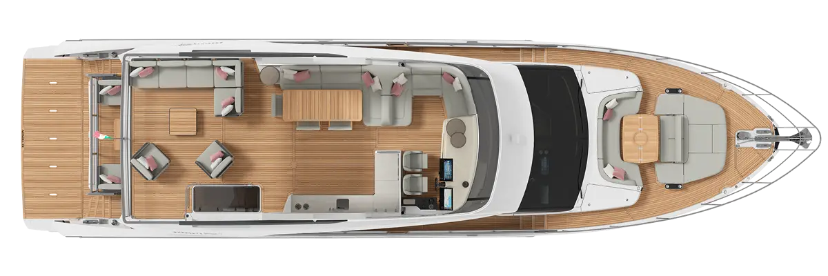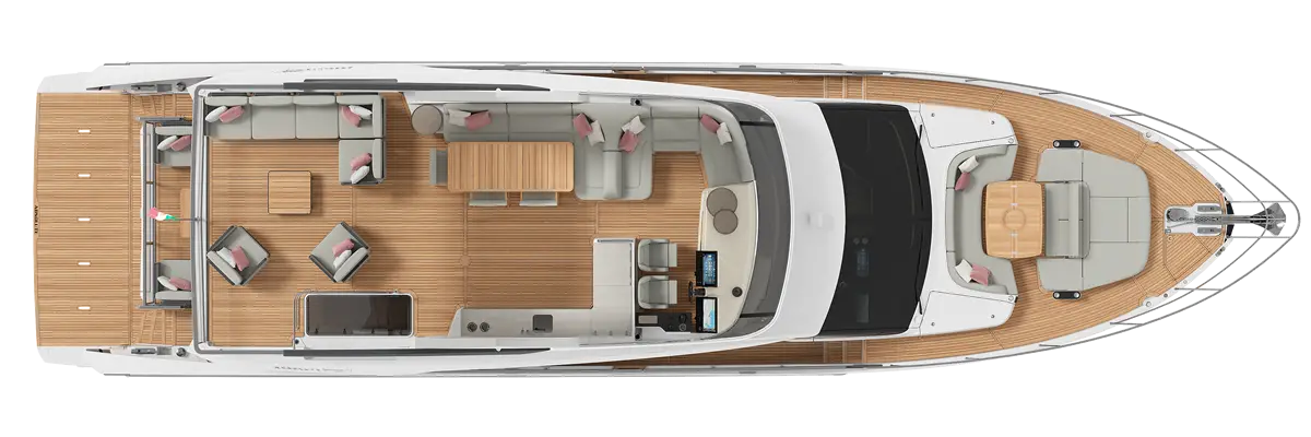 The spacious and bright outdoor areas, designed for maximum comfort and refinement, include a versatile cockpit terrace with modular furnishings that allow for personalized space arrangements, and a convertible bow sundeck, ideal for moments of absolute freedom on the open sea.