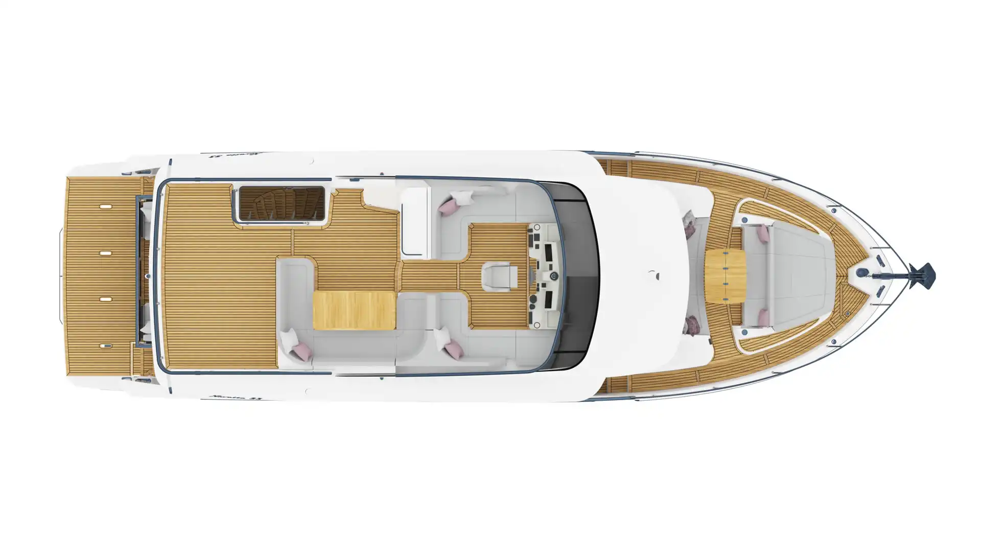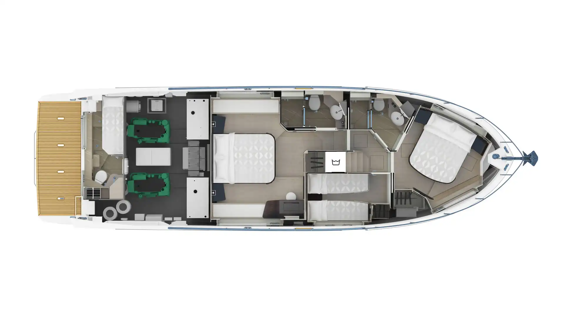 The main salon of the Navetta 53, with its 360-degree panoramic view, envelops guests in an embrace of light and space. The elegant environment features carefully curated furnishings and a well-equipped kitchen, seamlessly integrated with the cockpit. The modern and ergonomic command post offers a high level of technology and a convenient side door for autonomous maneuvers. The full-beam master cabin, located amidships, features large windows, a queen-size bed, and ample storage options. The forward VIP cabin and the third central cabin, both generously illuminated by natural light, reflect the same attention to comfort and design, ensuring a pleasant and luxurious stay. Thanks to the Volvo Penta IPS propulsion, the Navetta 53 offers exceptional performance and reduced fuel consumption, ensuring a superior sailing experience.