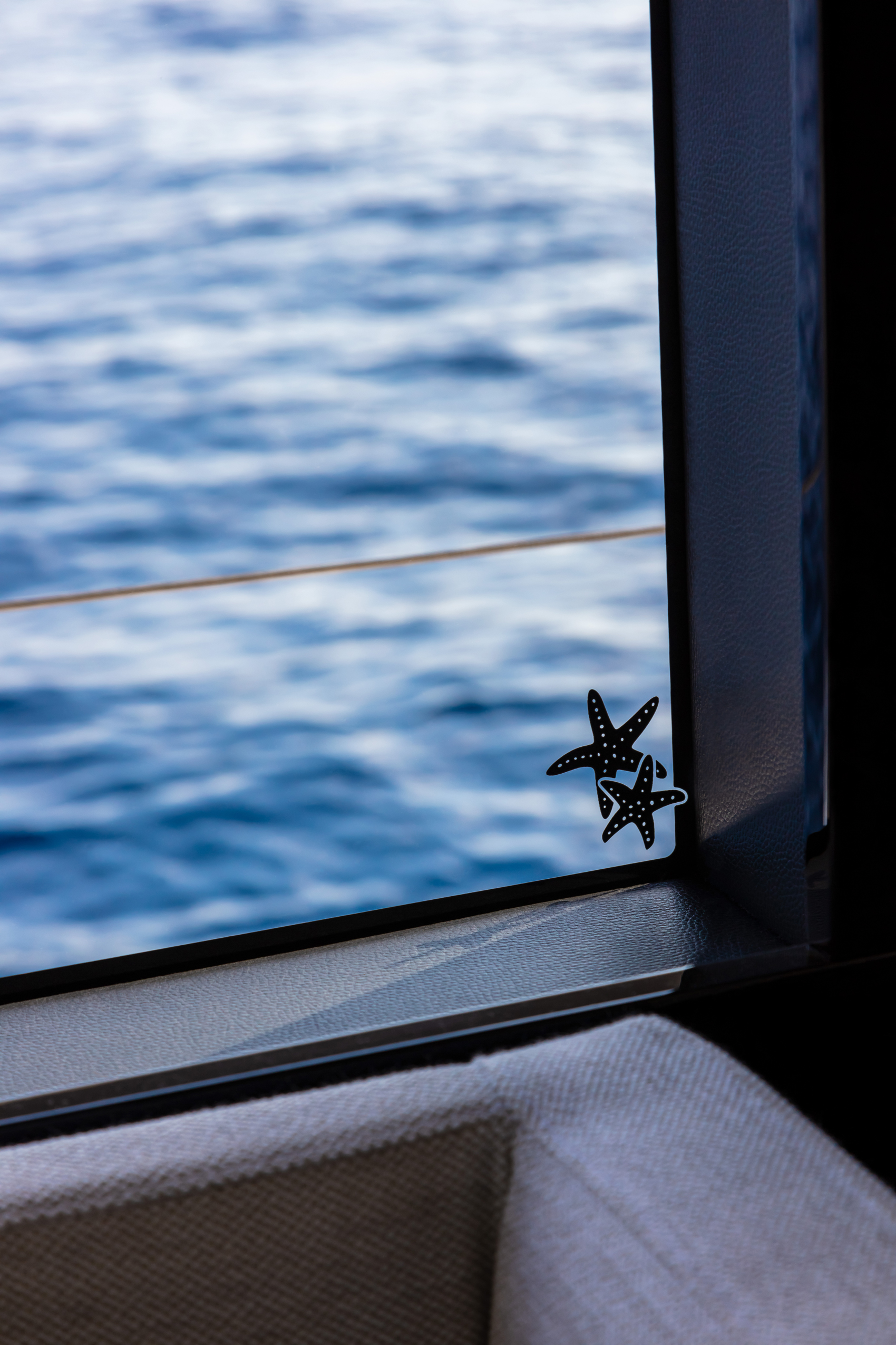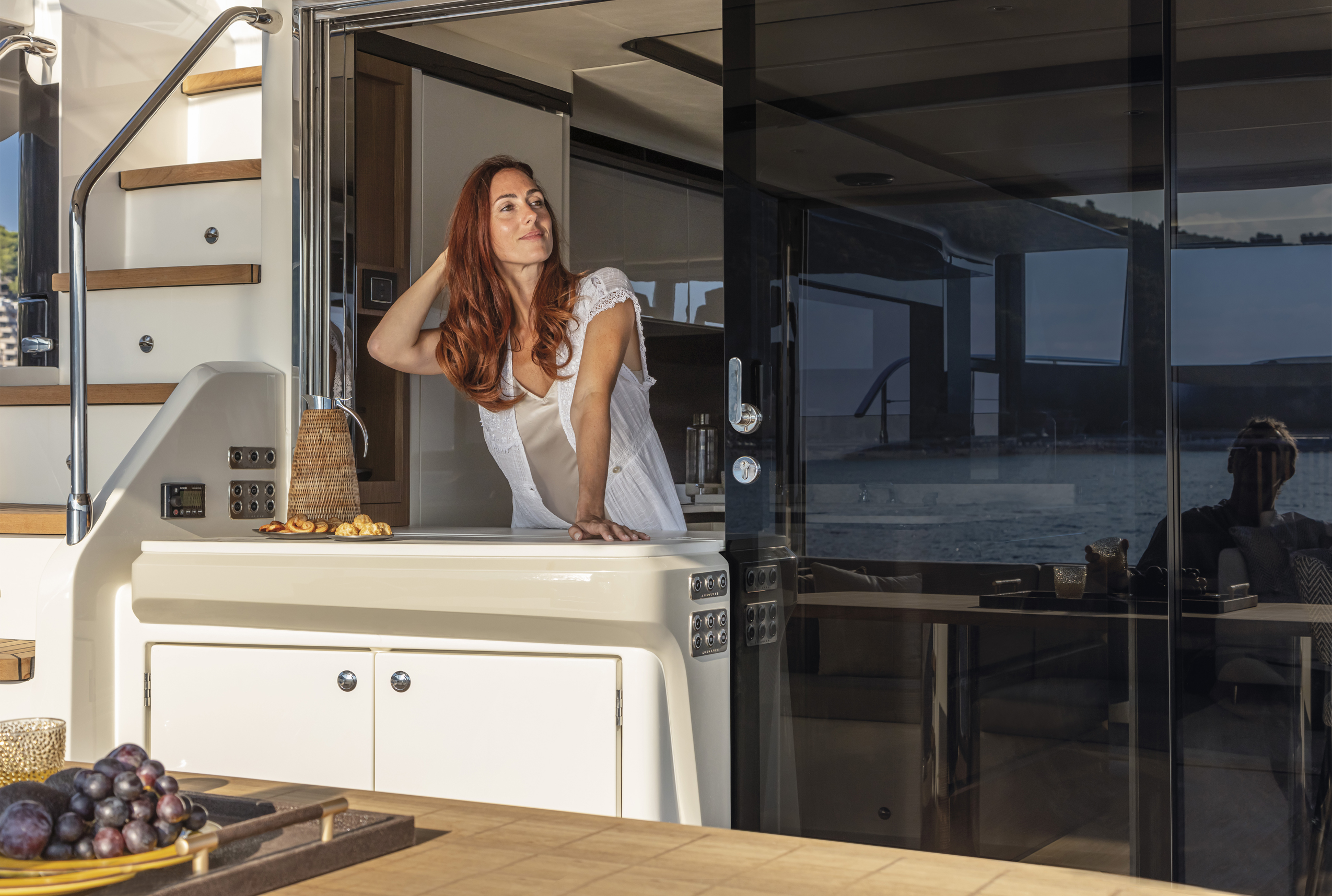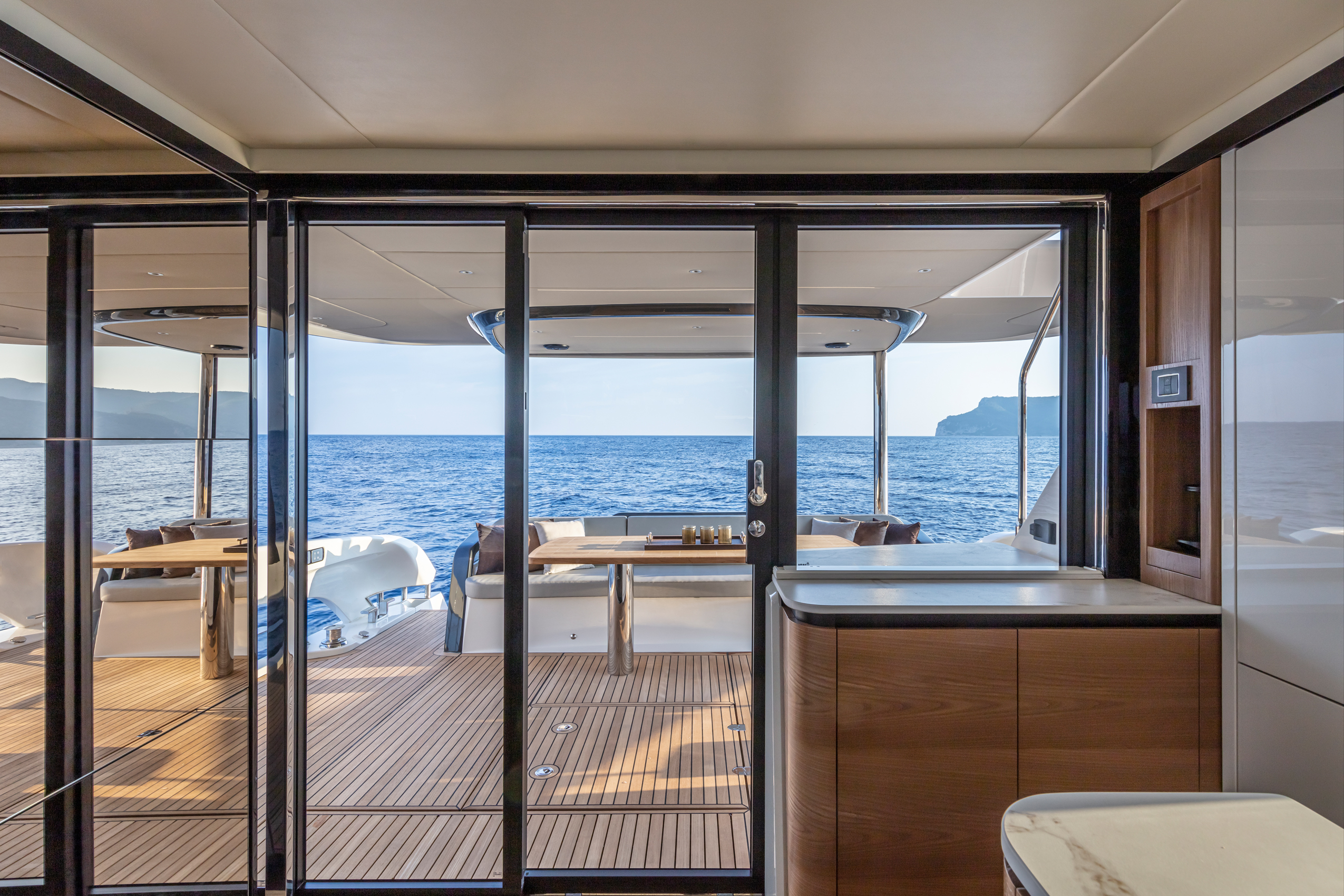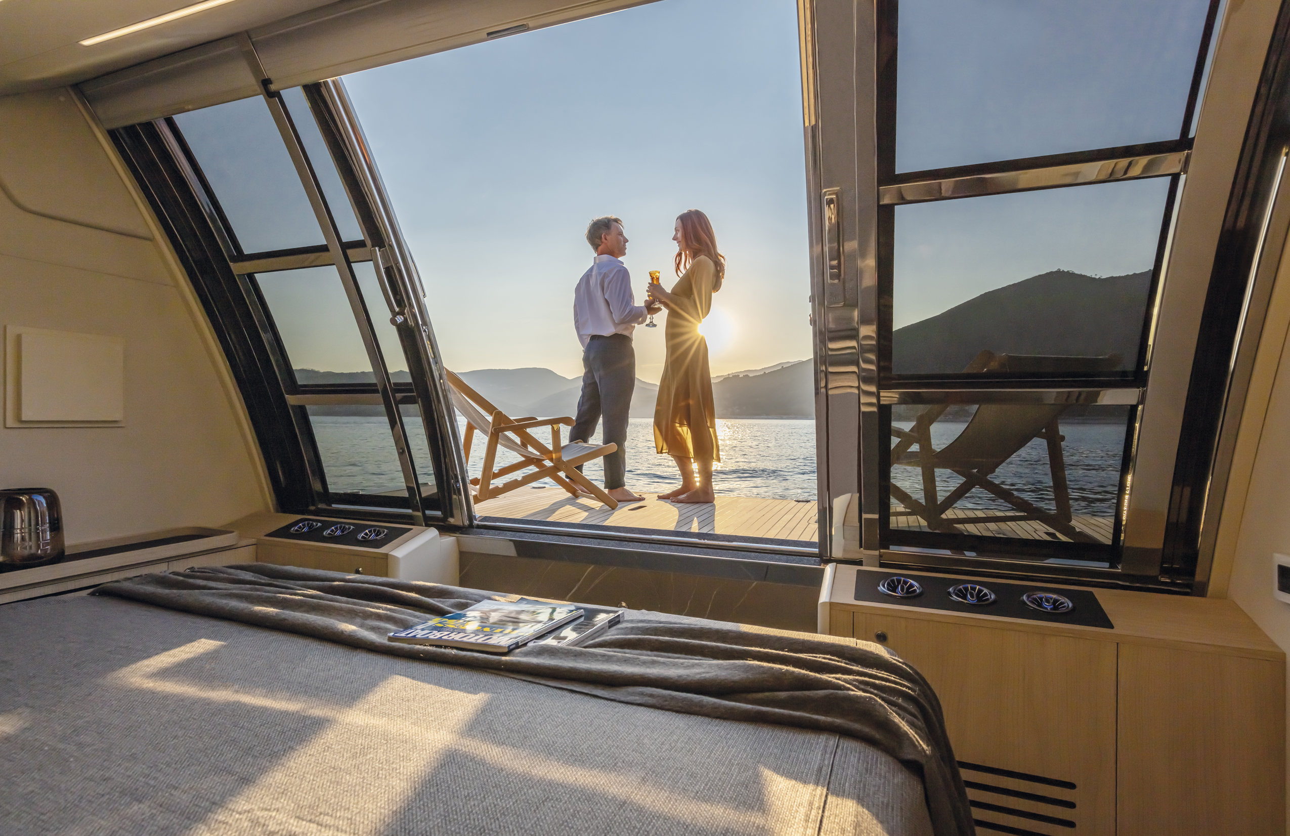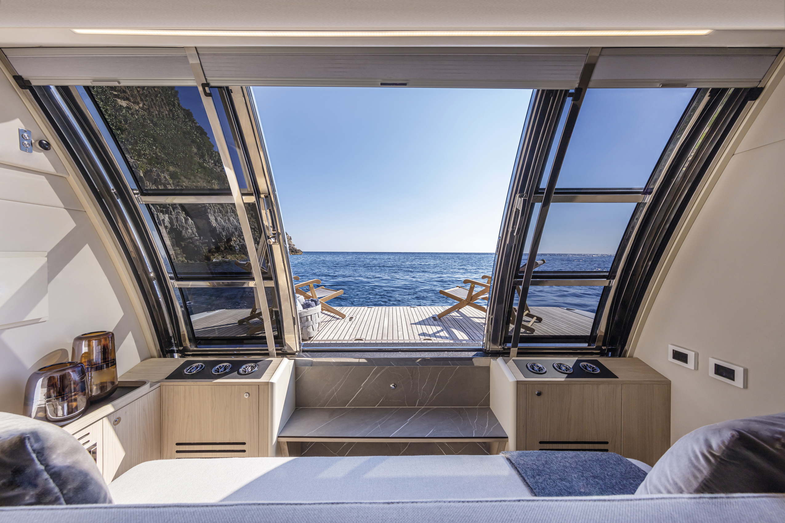 The wide and uninterrupted side-glass window, which runs from the aft mirror to the windshield, outlines her exterior shapes. These are characterized by the significant enlargement of the bow windows and the opening of the side gunwales in the cockpit.