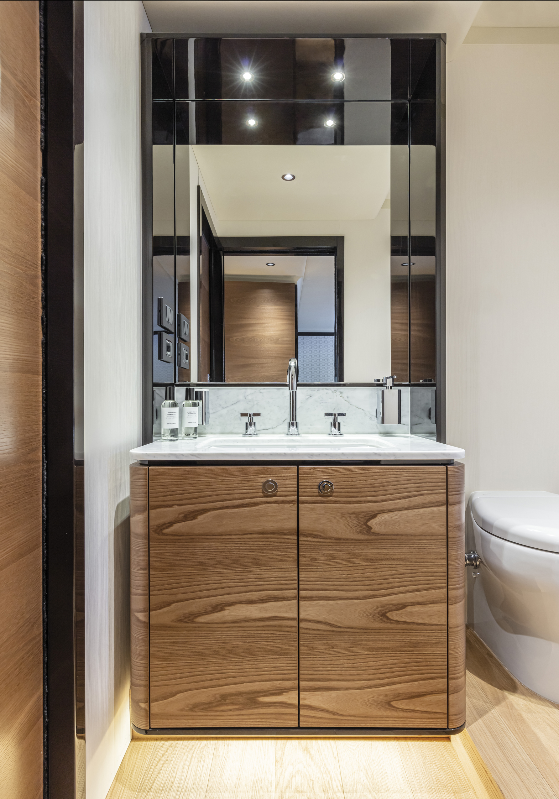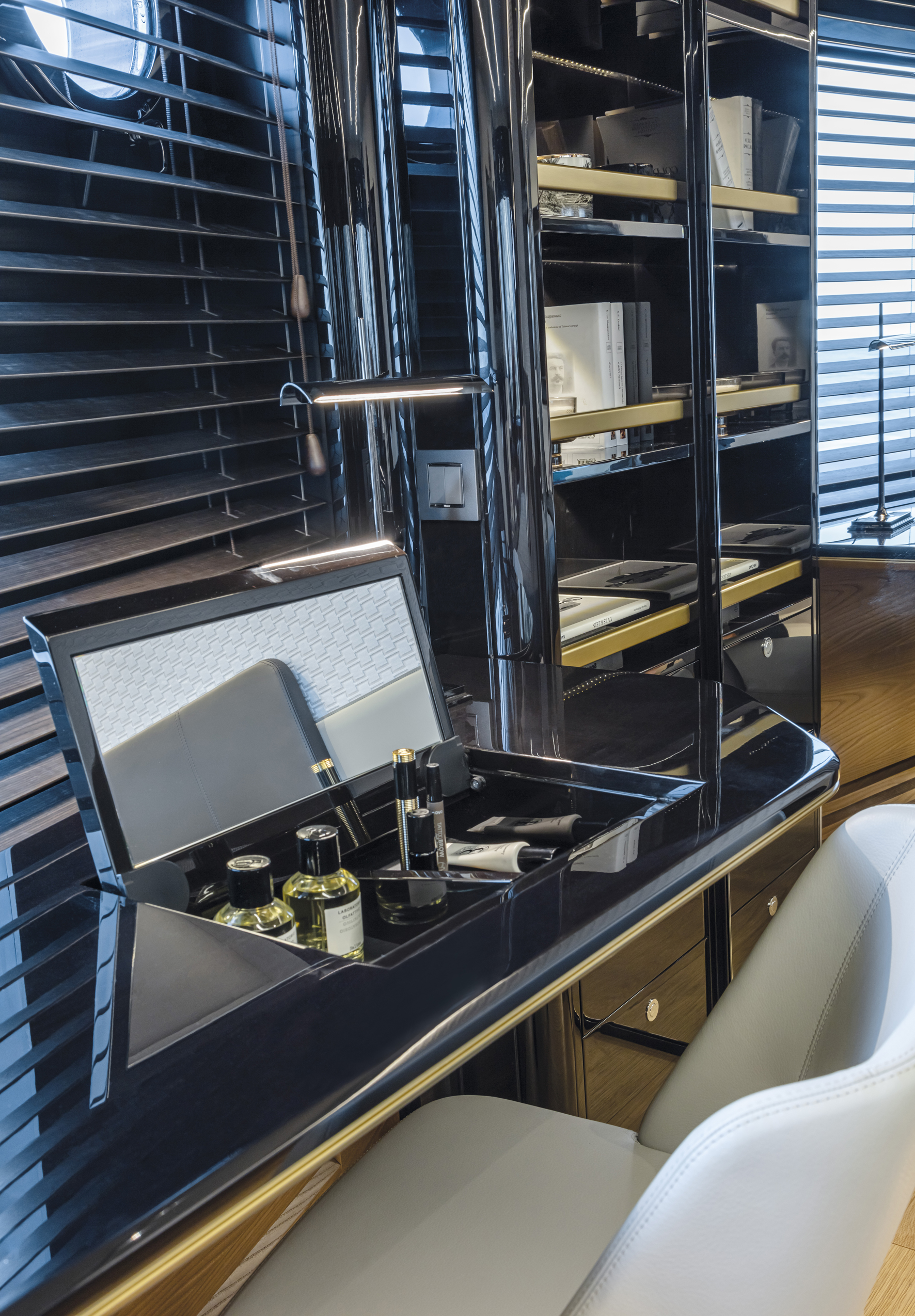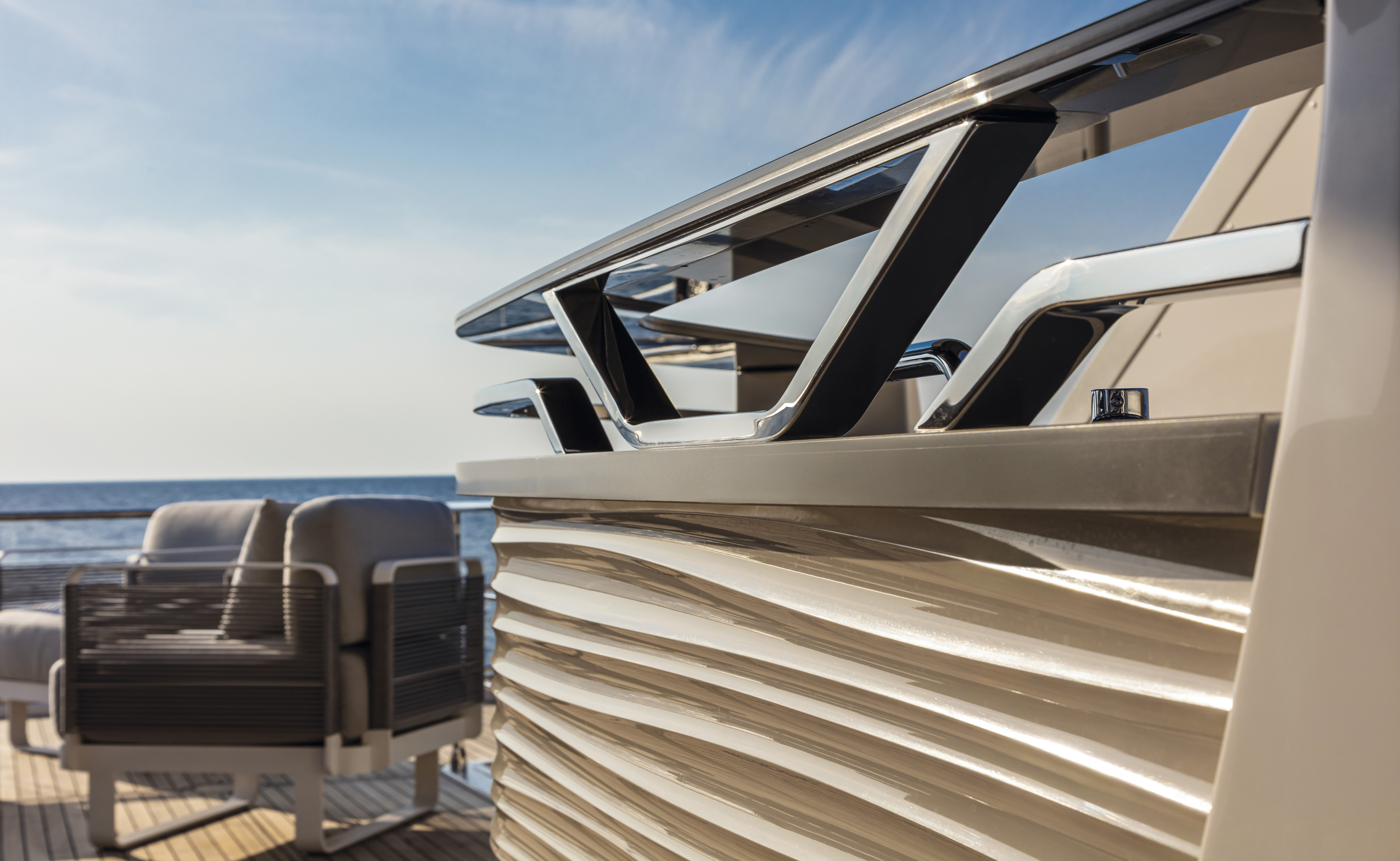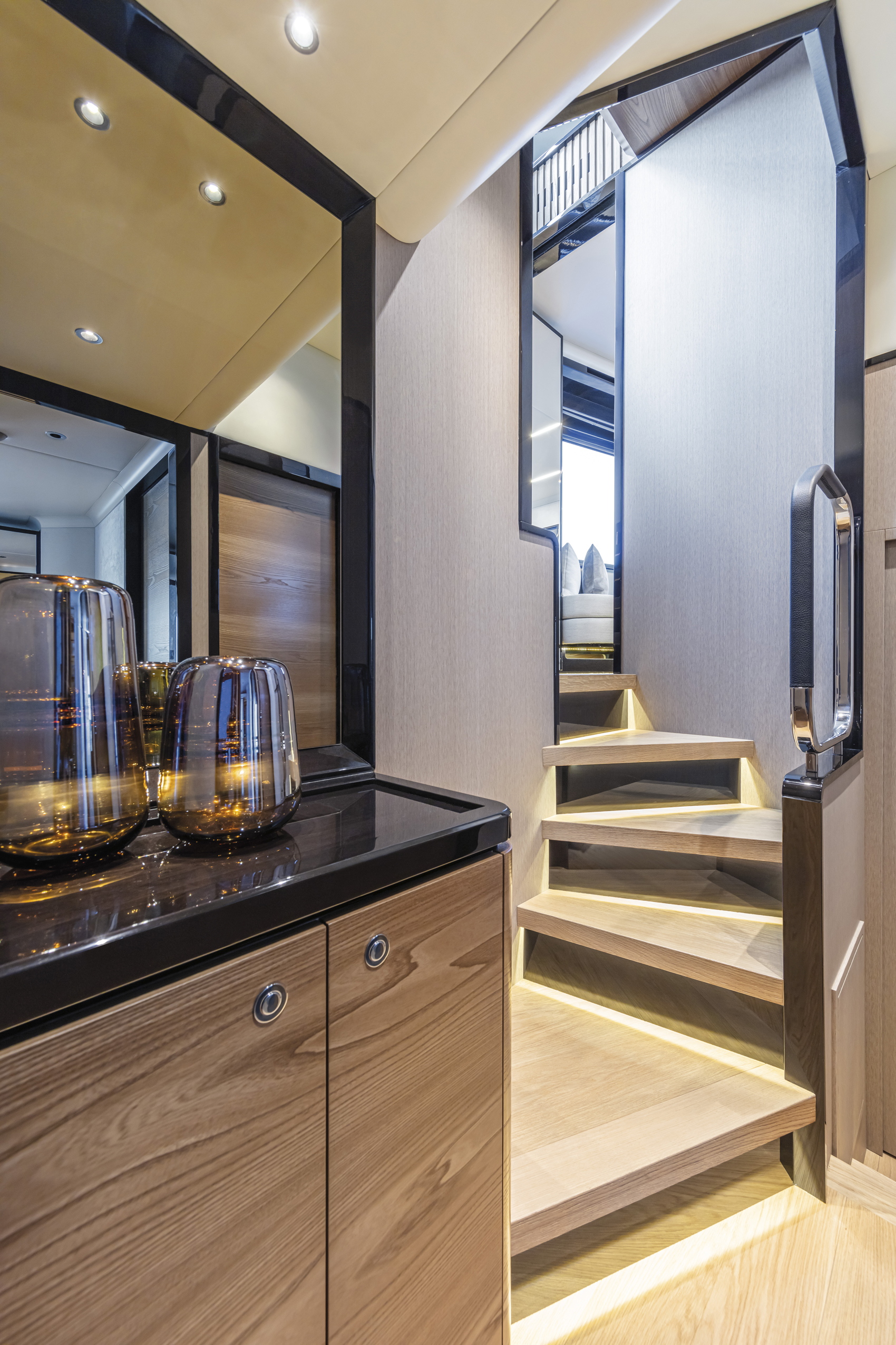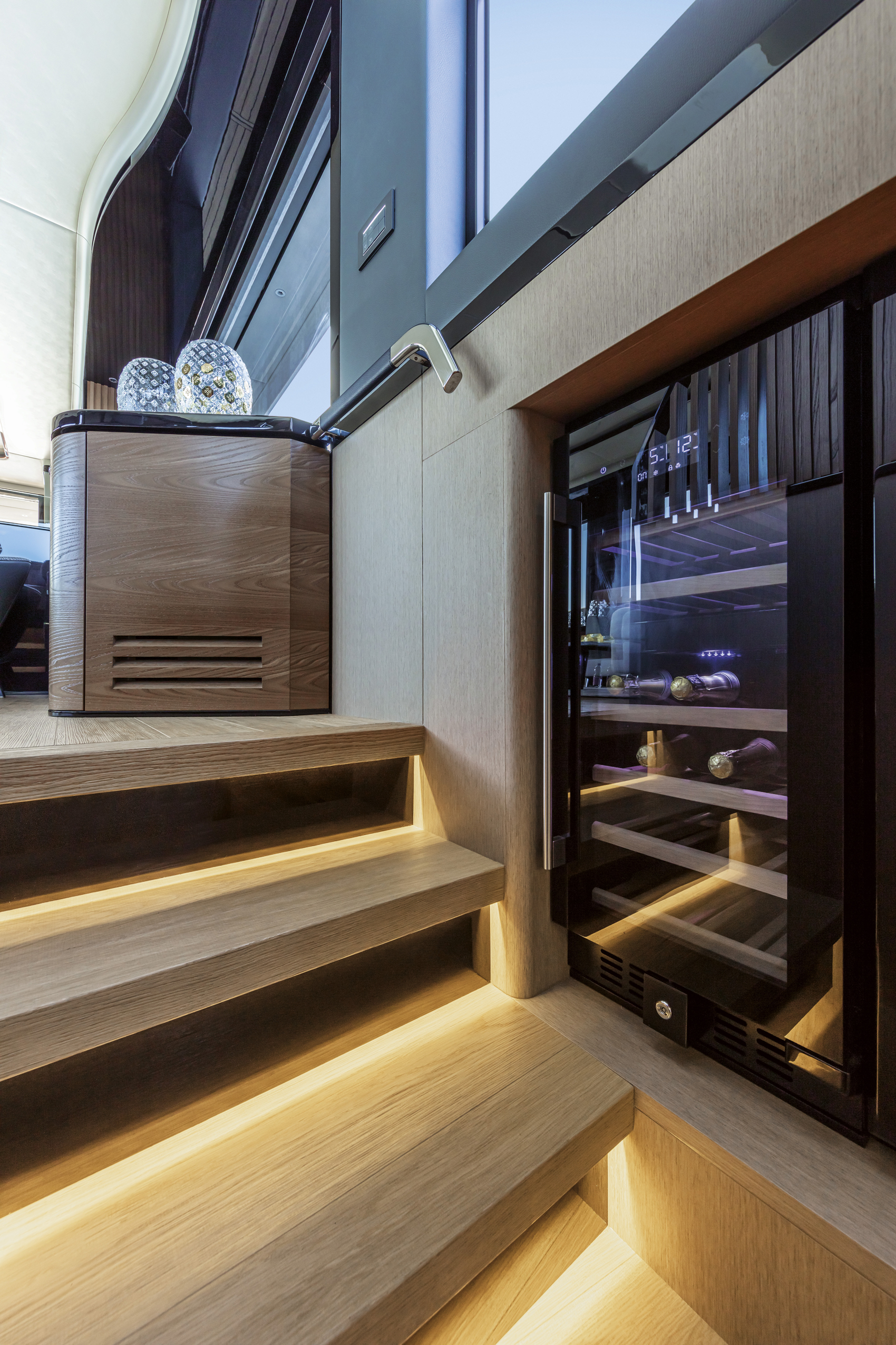 The wide and uninterrupted side-glass window, which runs from the aft mirror to the windshield, outlines her exterior shapes. These are characterized by the significant enlargement of the bow windows and the opening of the side gunwales in the cockpit.
