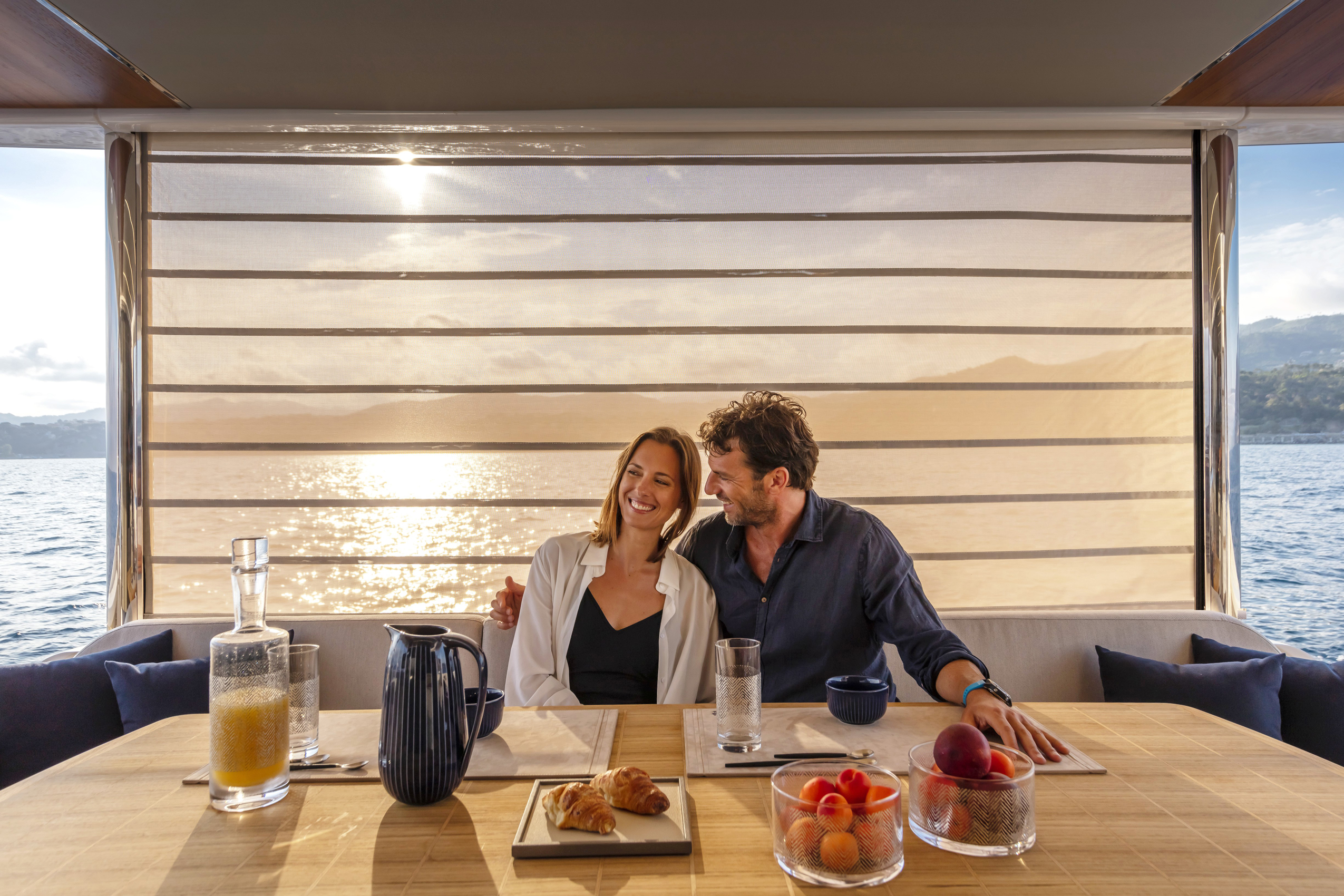 The Navetta 68 is a result of unburdened creativity and collaboration among our design team and artisans. Offering superior livability, her large and functional spaces are elegantly furnished, designed only to produce maximum comfort. The structure is innovative, the exterior lines are full of personality, and are outlined by the majestic, pillarless side windows