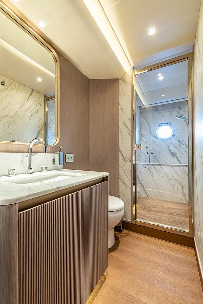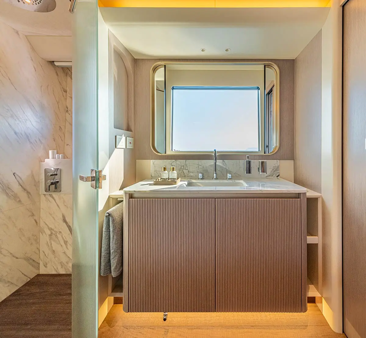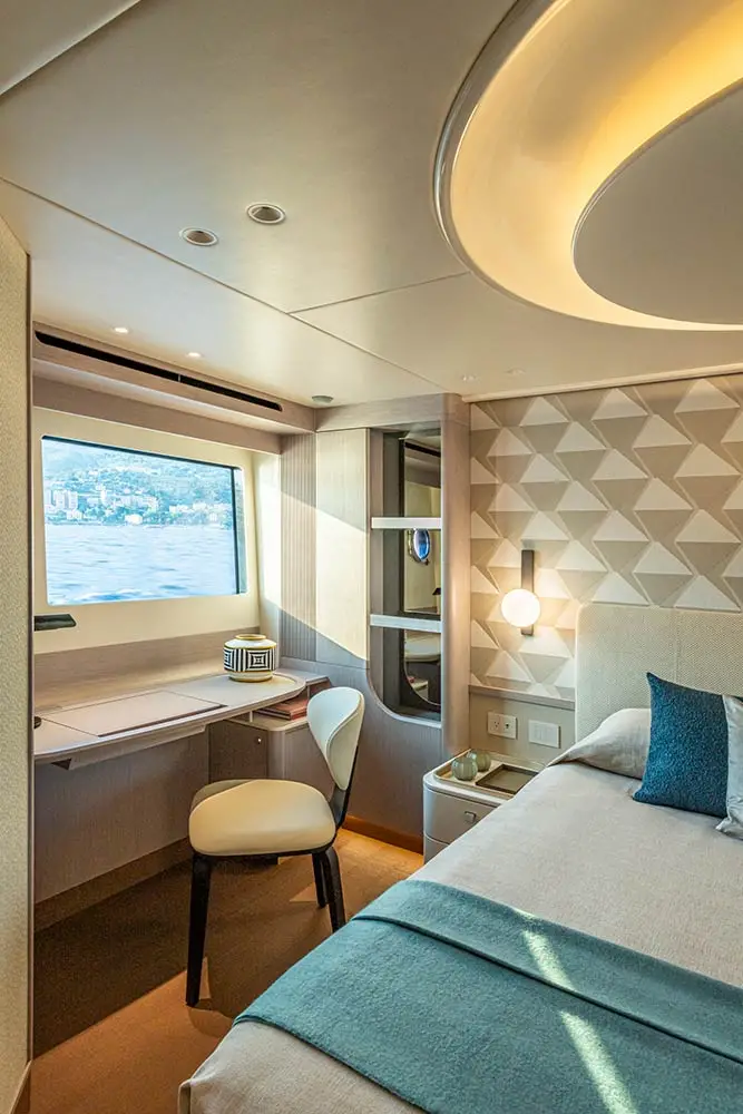 This yacht has also been designed to enjoy a 360-degree view of the sea on board, with the perception of being on a vessel with much larger volumes. The spacious kitchen and the ample lounge further contribute to the impression of even more generous spaces.