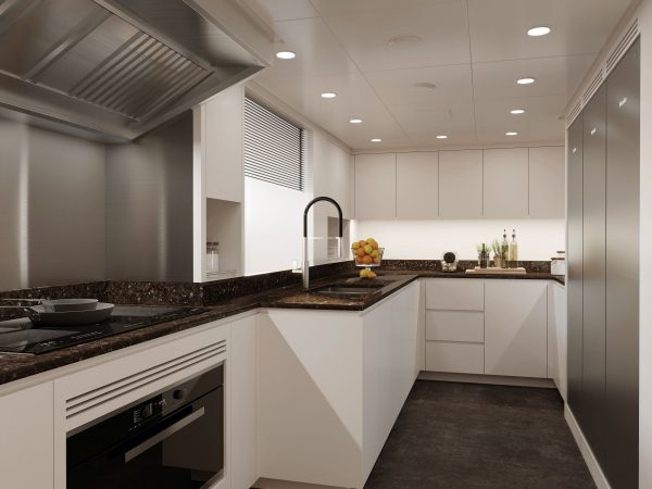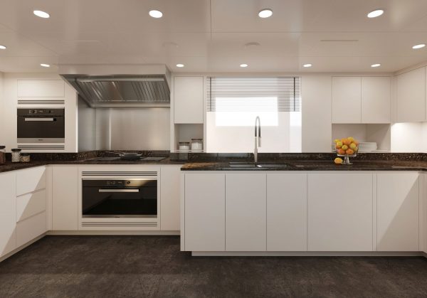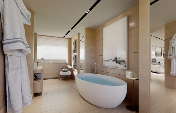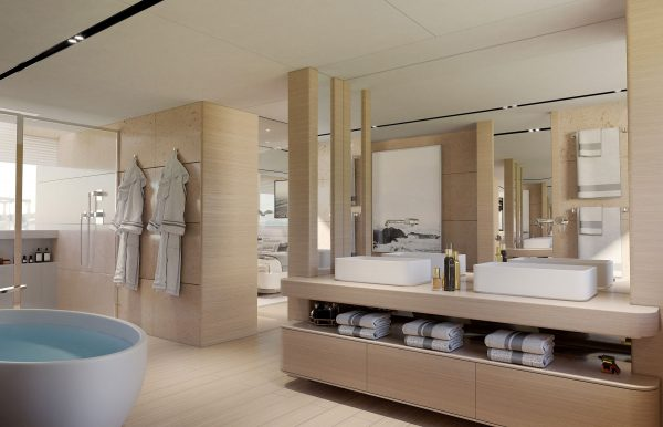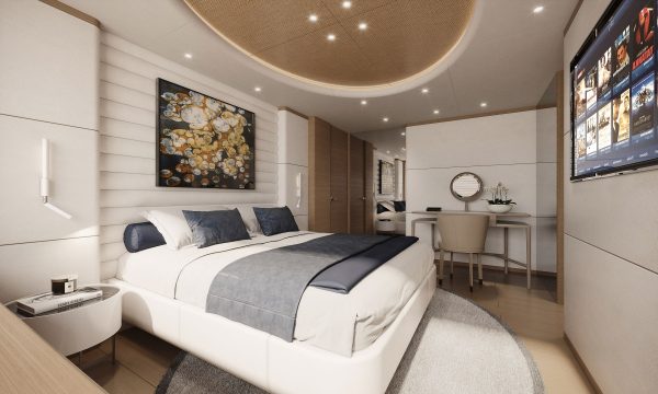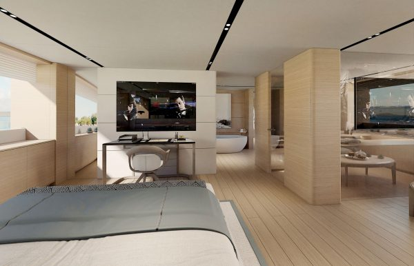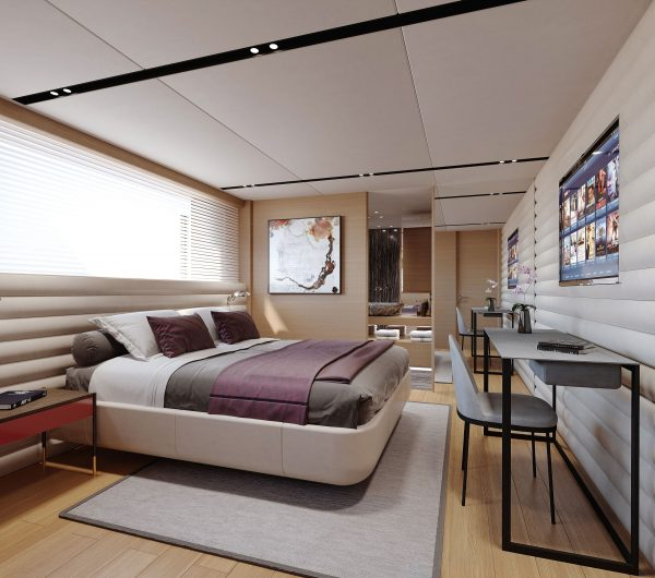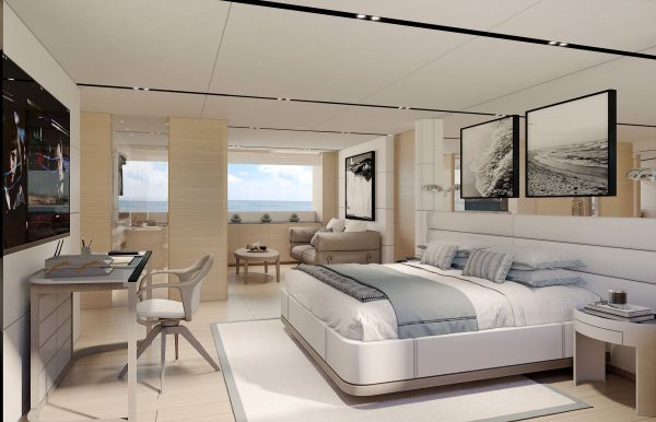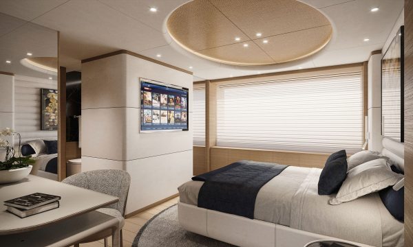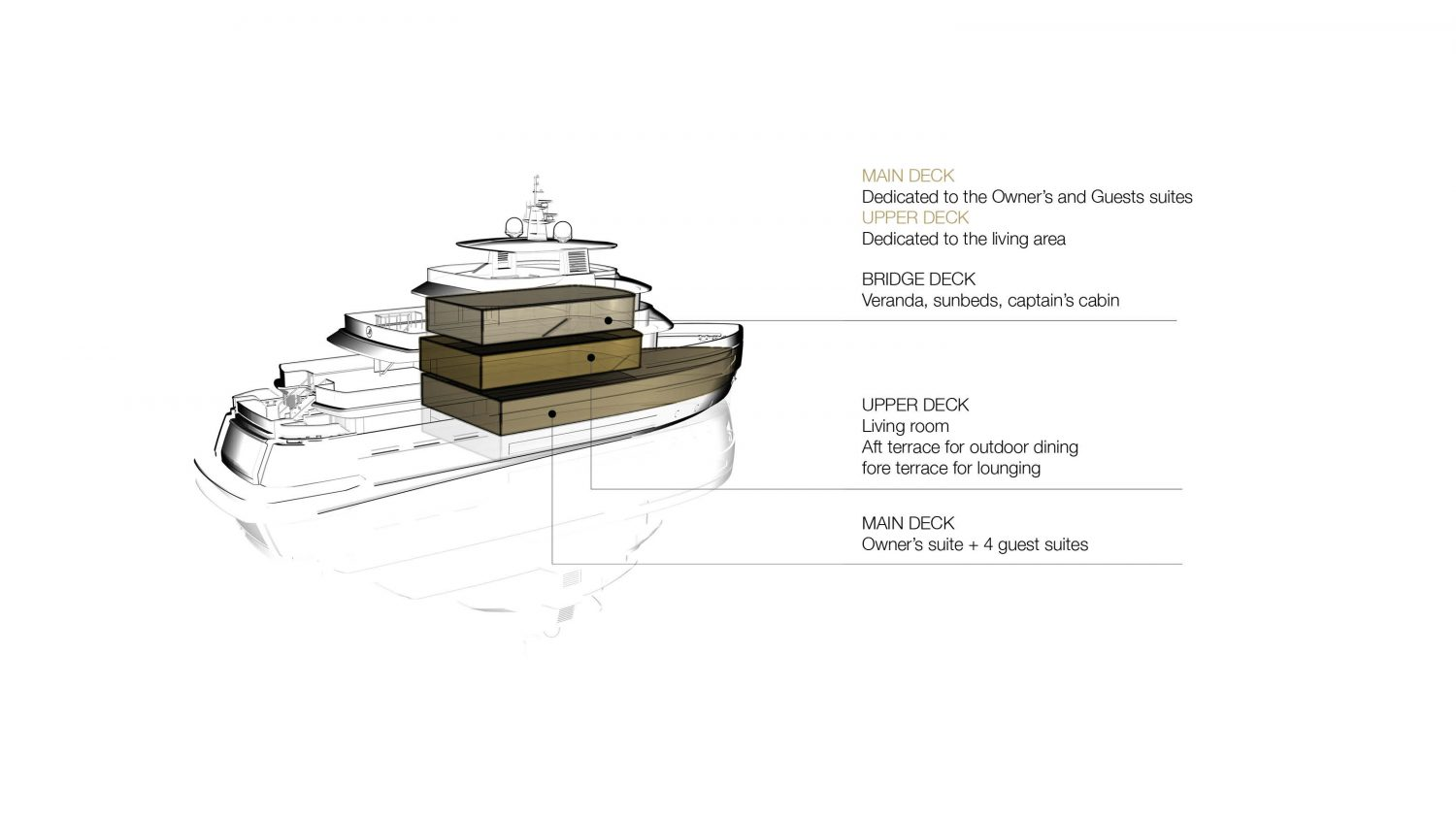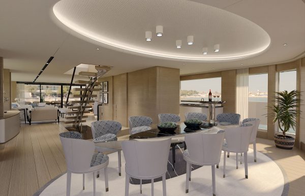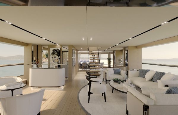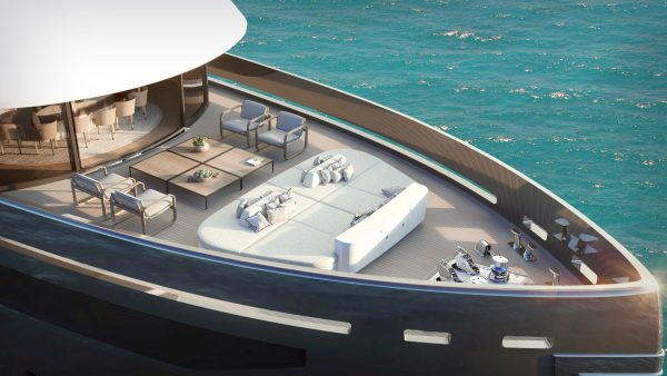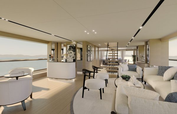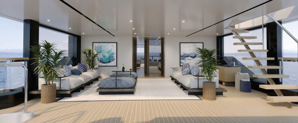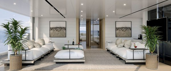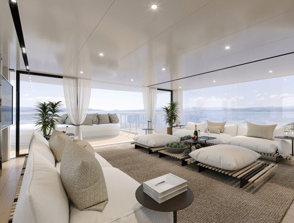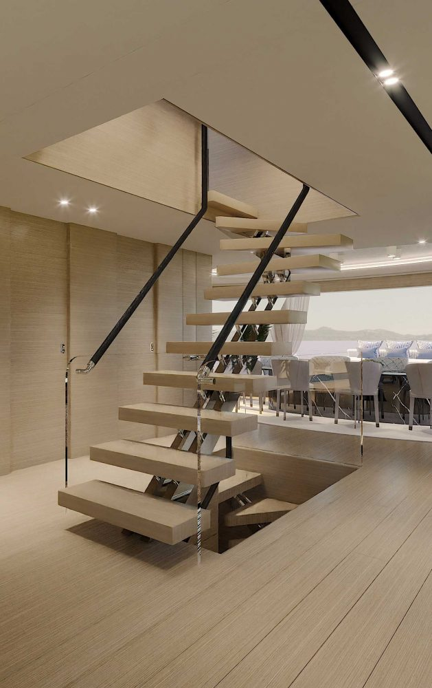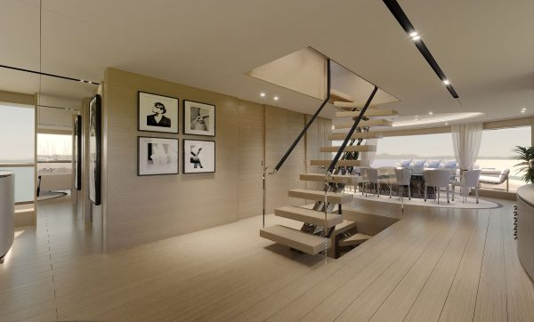 and are perfectly integrated with the yacht’s silhouette, making it possible to add a fourth deck with huge windows from which there are unparalleled panoramic views of the sea.