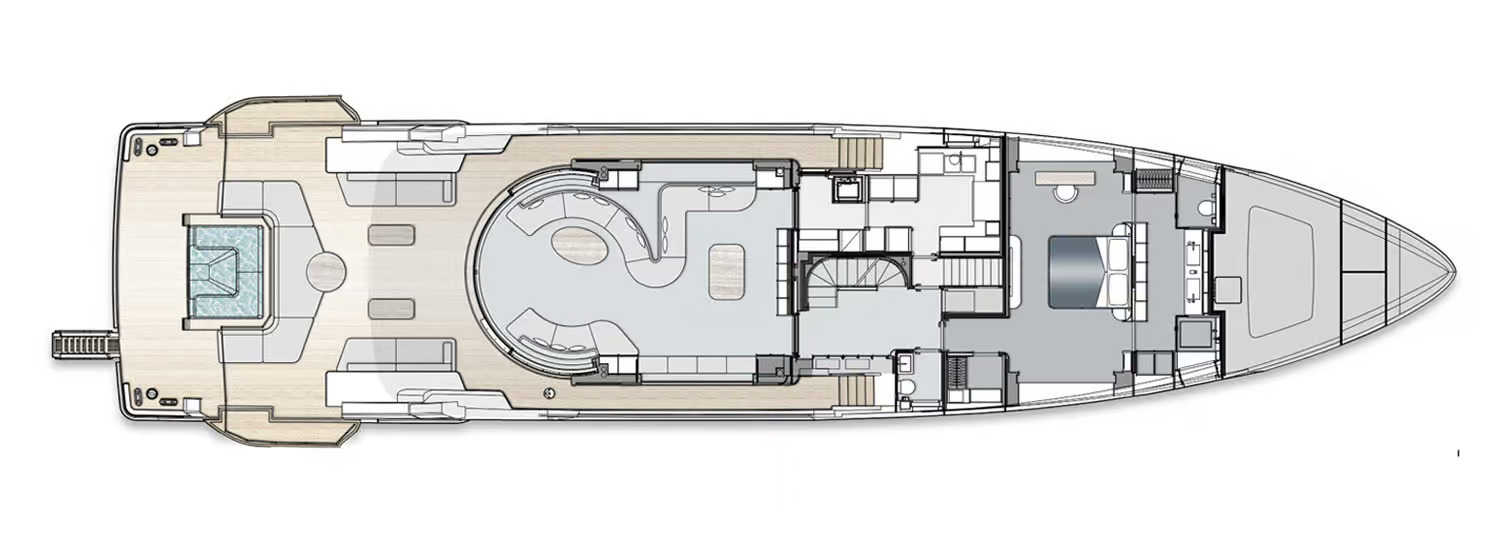 The Oasis 34M presents an open-space concept, avoiding visual barriers to achieve a smooth continuity between the interior and exterior environments. Inspired by the outside, the choice of materials and colors creates a sophisticated allure.