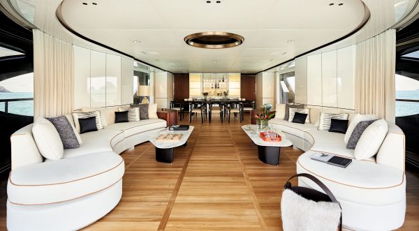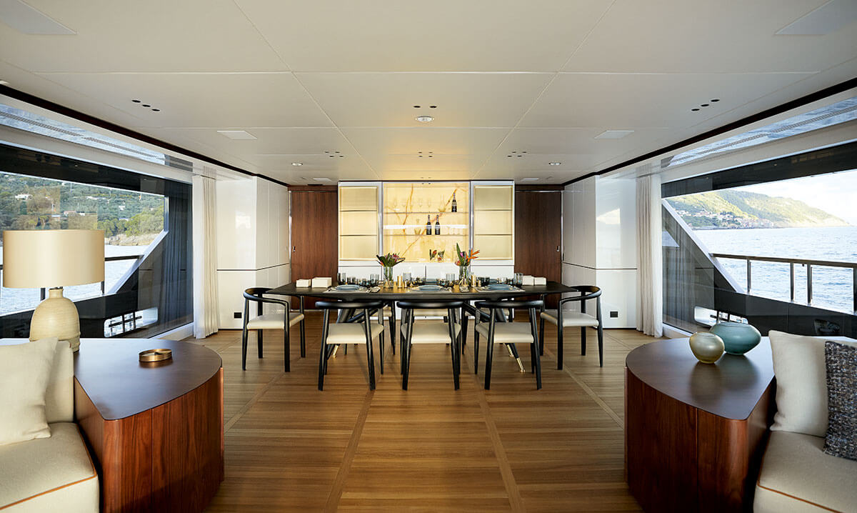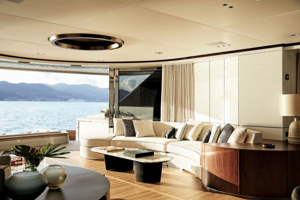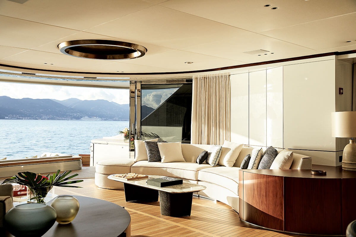 A sleek connection between the interior and the exterior areas allows owners and guests to smoothly transition through, suggesting relaxed atmospheres for an informal and flexible lifestyle on board.