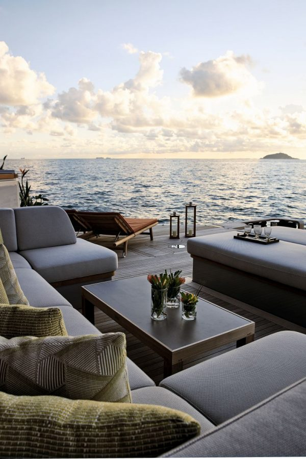 Access to the water is sinuous and immediate, occurring also via the mobile Sea Lift, which may conveniently serve as a diving platform and jet ski transport system. At the heart of the deck, the infinity pool pairs with an inviting and leisurely oceanside social setting.