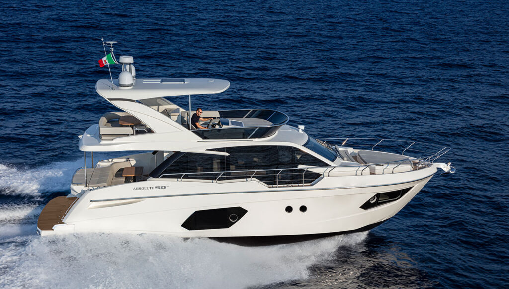 The Absolute 50 Flybridge is truly the ‘Absolute Achievement’ thanks to an excellent balance of size and functionality that nurtures the comfort of your guests. Dynamic and innovative, this yacht decidedly captivates your senses through elegant color combinations, fine materials, and exquisite finishing touches.