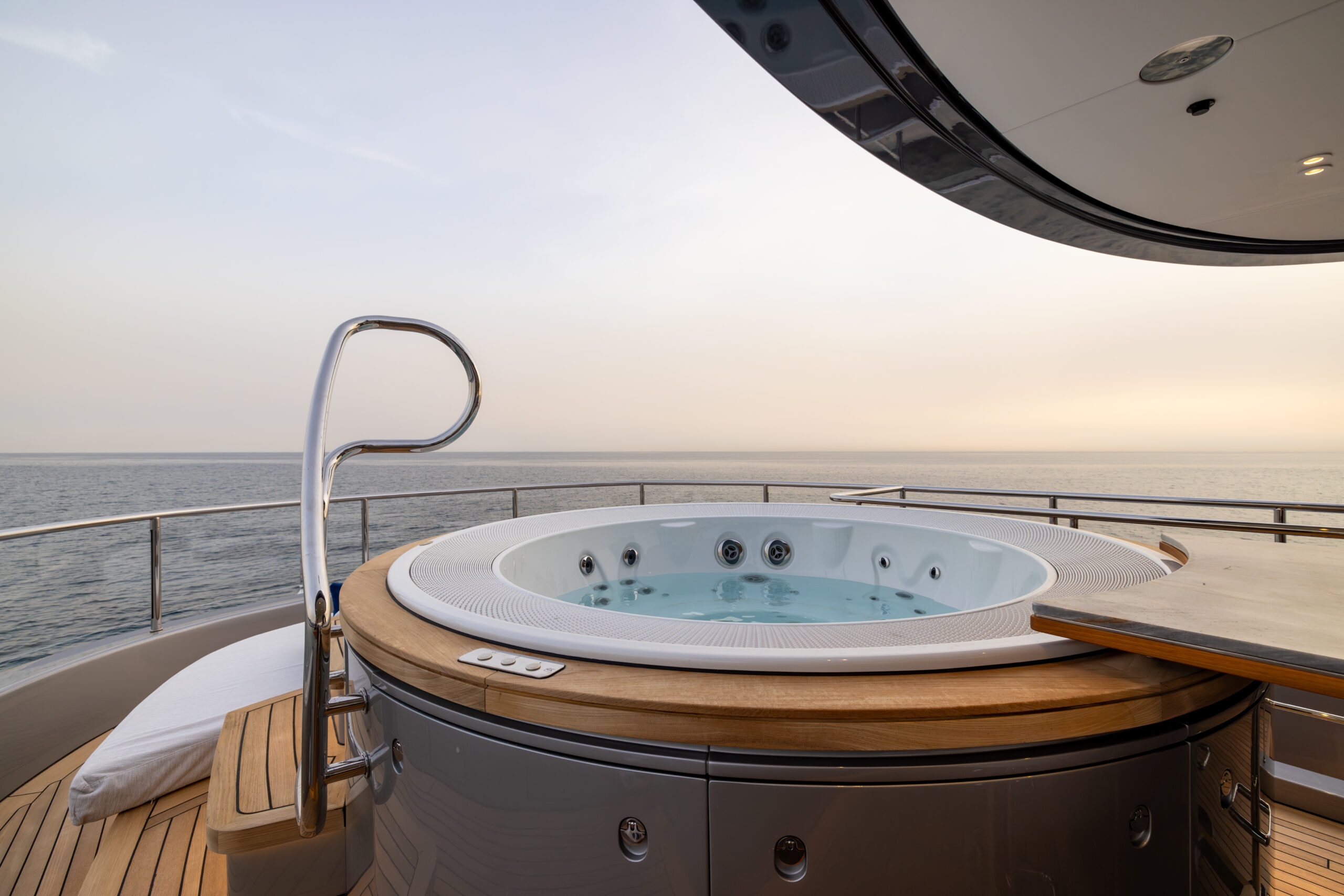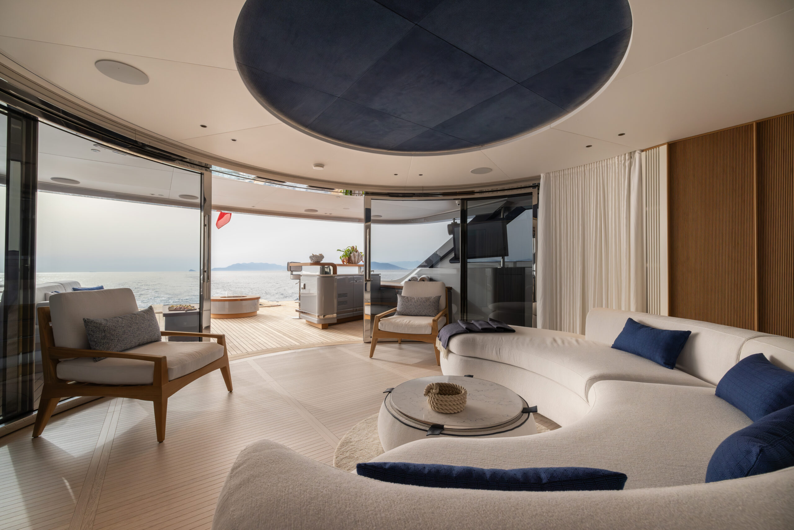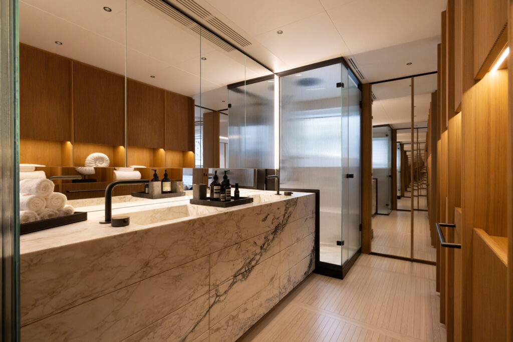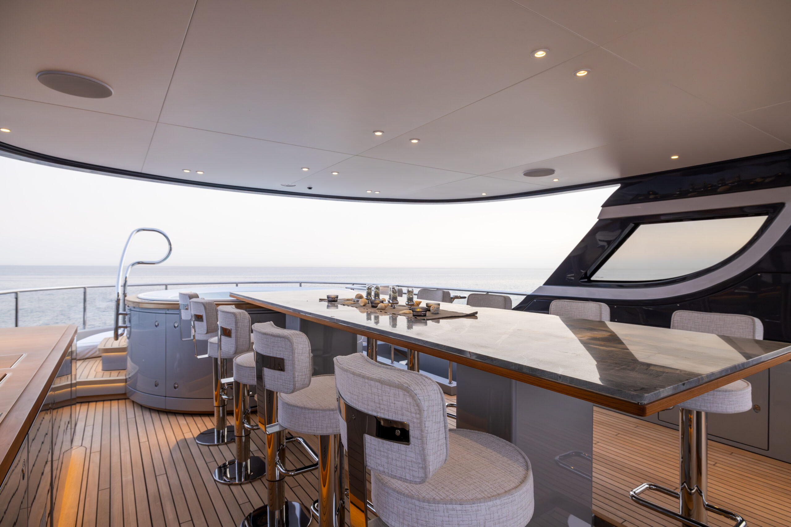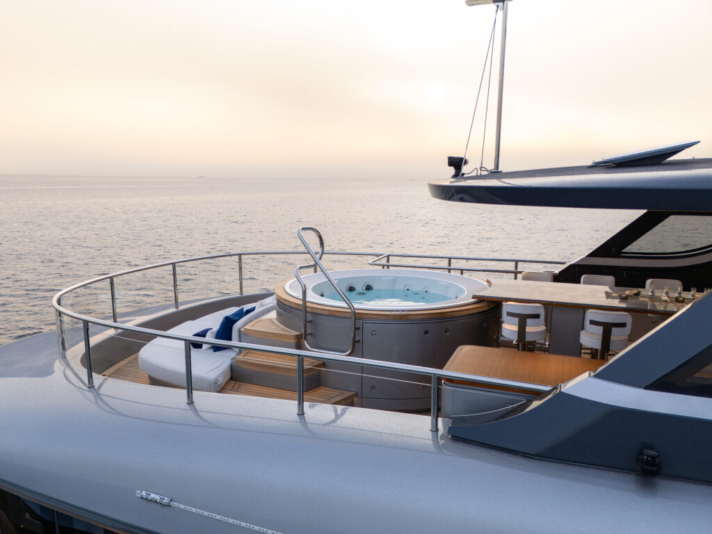 This yacht has a phenomenal layout, with a large Oasis Deck that includes a dipping pool, expanding wings, and fantastic indoor/outdoor flow. Enjoy an unobstructed 270-degree view off the stern, even from the salon. It has 5 staterooms and four full decks including an additional jacuzzi on the Skydeck, Jetski crane, additional bar on the Oasis Deck, Glass railing, pop out balcony off the master stateroom and more. It is fully loaded with all the top A/V and technology on the market and beautifully designed with a modern and sophisticated touch with sea-inspired marble and quartz top finishings.