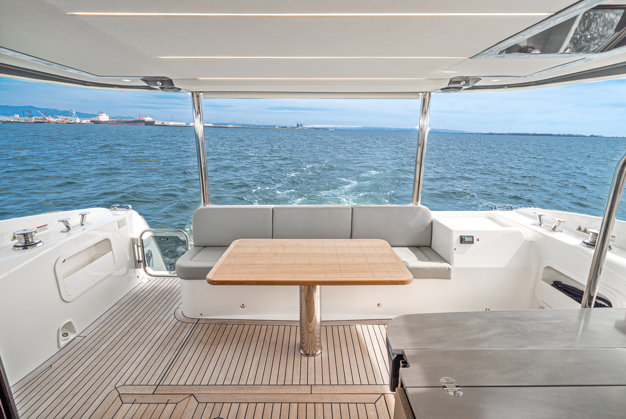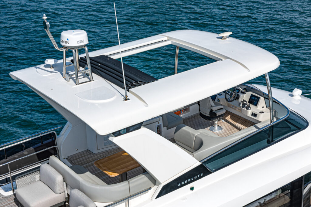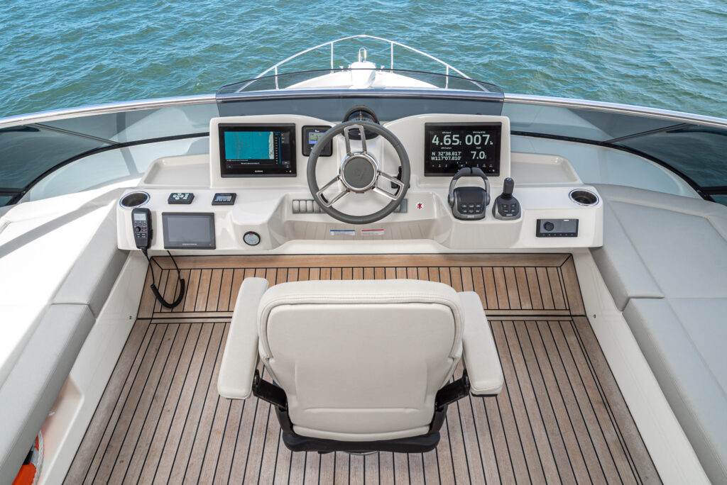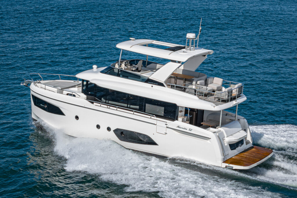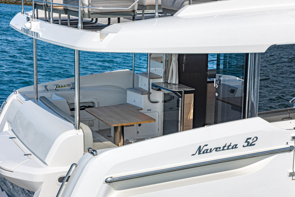The 52 Navetta offers significantly higher livability than that found on other similarly sized yachts, without giving up performance or reliability. The fly area has a well-equipped helm area surrounded by sofas, an outdoor galley with a comfortable dining table, and a panoramic terrace. At the bow, you find spacious, modular sun loungers that are highly versatile and encourage socializing.