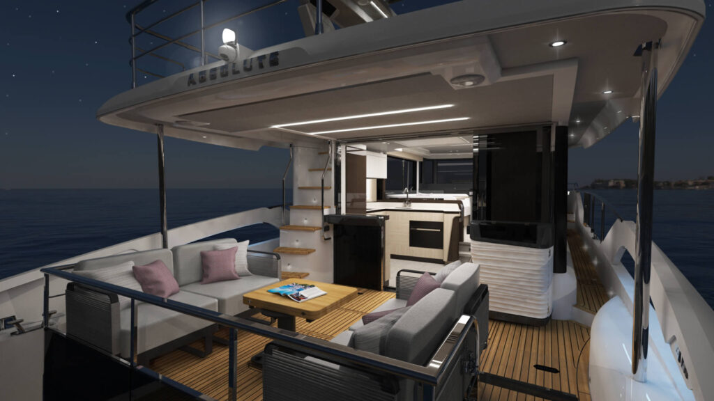 The Navetta 53, a recent masterpiece by Absolute Yachts, embodies the brand’s pursuit of innovation and superior craftsmanship. This yacht marks a significant advancement in both design and onboard comfort, rivaling that of much larger vessels. Its distinctive aesthetic is highlighted by open gunwales and large panoramic windows, contributing to its sophisticated silhouette while offering breathtaking views. Every element showcases Absolute’s dedication to quality, featuring impeccable finishes and clean, minimalist lines in a palette of soft creams and warm hazelnut tones with matte accents. These refined design elements integrate with the yacht’s solid construction, delivering an unmatched visual and sensory experience.