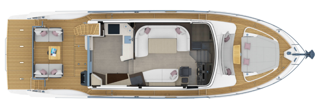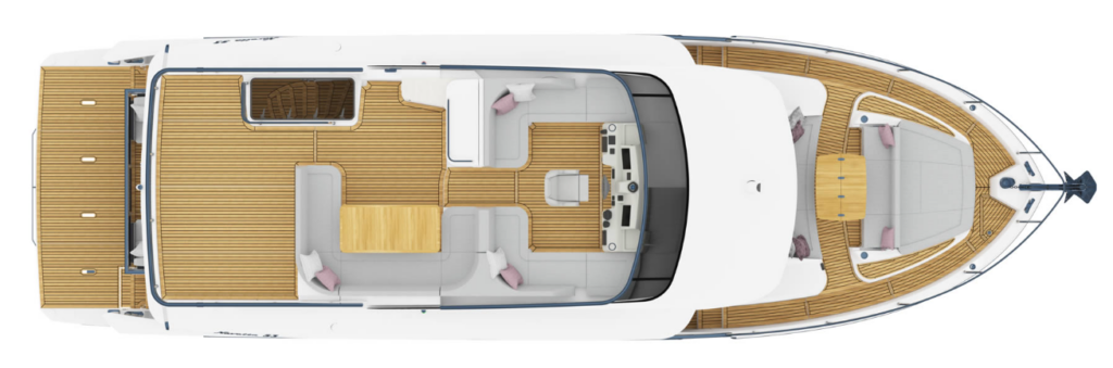 A standout feature of the Navetta 53 is its exceptional livability: expansive spaces and large windows immerse you in the surrounding seascape, while the thoughtfully designed layout ensures seamless movement, with minimal steps, lofty ceilings, and sliding doors that maximize space. The cockpit terrace, spacious and versatile, is perfect for entertaining guests from morning to night. This area can be personalized with modular furniture, allowing you to tailor the setting to your preferences. The glass aft railing provides stunning views, while the illuminated pathways at the bow enhance both safety and ambiance. The flybridge, complete with a helm station and plush seating, offers panoramic views and elevates the sailing experience, making it an ideal spot for leisurely dinners and memorable moments.