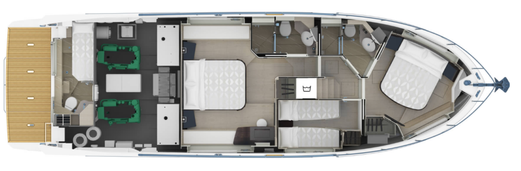 The Navetta 53’s main salon, with its sweeping 360-degree views, bathes guests in natural light and spaciousness. This refined setting is adorned with thoughtfully selected furnishings and includes a fully equipped kitchen that seamlessly connects to the cockpit. The modern, ergonomic helm station is equipped with cutting-edge technology and features a side door for easy, independent maneuvering. The full-beam master cabin, positioned amidships, offers expansive windows, a queen-size bed, and ample storage. The forward VIP cabin and the third central cabin, both filled with natural light, are designed with the same focus on comfort and elegance, ensuring a luxurious and enjoyable stay. Powered by Volvo Penta IPS propulsion, the Navetta 53 delivers impressive performance and enhanced fuel efficiency, providing an exceptional sailing experience.