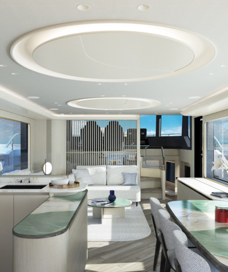 The Navetta 70’s innovative design showcases a masterful and harmonious distribution of spaces. The interiors impress with an elegant, contemporary style, featuring finely crafted furnishings made from light-toned, premium woods, accented with sinuous curves and bronze details. Space-saving sliding doors, lofty ceilings, and a step-free layout enhance freedom of movement, offering an exceptional level of comfort. The flowing lines of the furniture, coupled with circular lighting motifs, create a sense of continuity and harmony throughout the interior. Expansive windows maintain a constant visual connection to the surrounding marine environment, inviting the beauty of the sea inside. For maximum privacy, the crew quarters are thoughtfully separated and well-appointed, offering two beds and a private kitchen to ensure a comfortable, discreet experience.