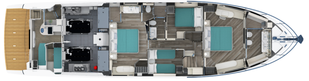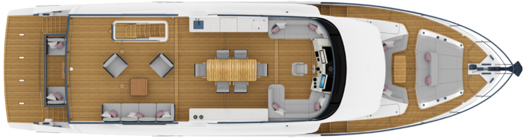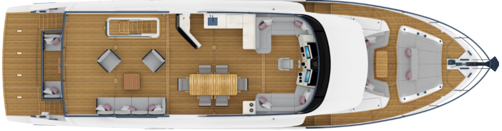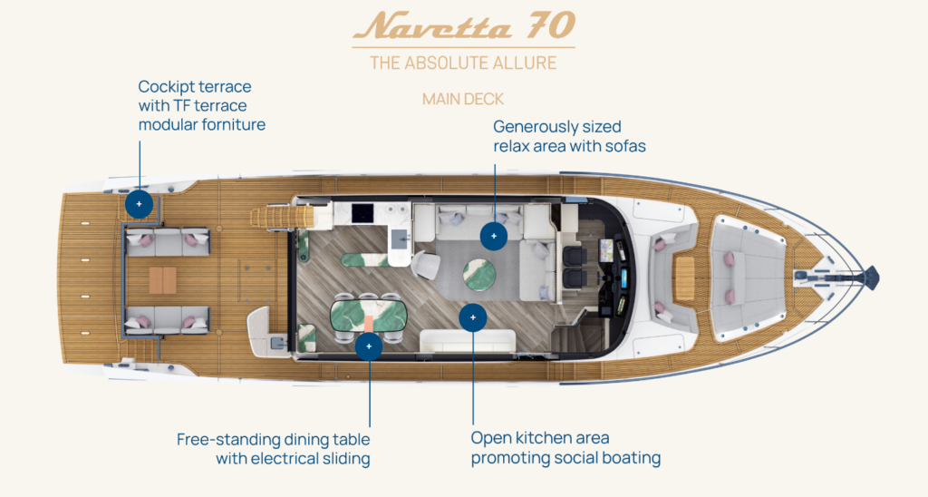 The solar panels are seamlessly integrated into the flybridge roof, these panels not only promote eco-friendly navigation but also offer unmatched flexibility and durability. Their remarkable efficiency supports onboard comfort during voyages and powers essential functions in the serene stillness of the bay. Designed to withstand impacts and resist the corrosive effects of saltwater, they represent an ecological choice that’s also built to last. The Navetta 70 masterfully blends cutting-edge innovation with timeless, refined elegance..