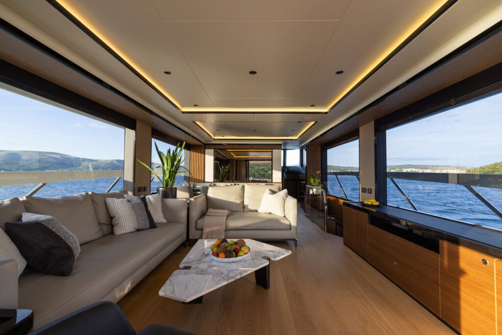 - Glass parapets and open gunwales in the cockpit area, evoking the sensation of a seamless “terrace on the sea”