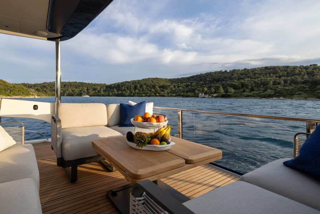 - Modular, non-fixed furnishings on both the flybridge and aft cockpit, offering versatile lounging and entertaining configurations