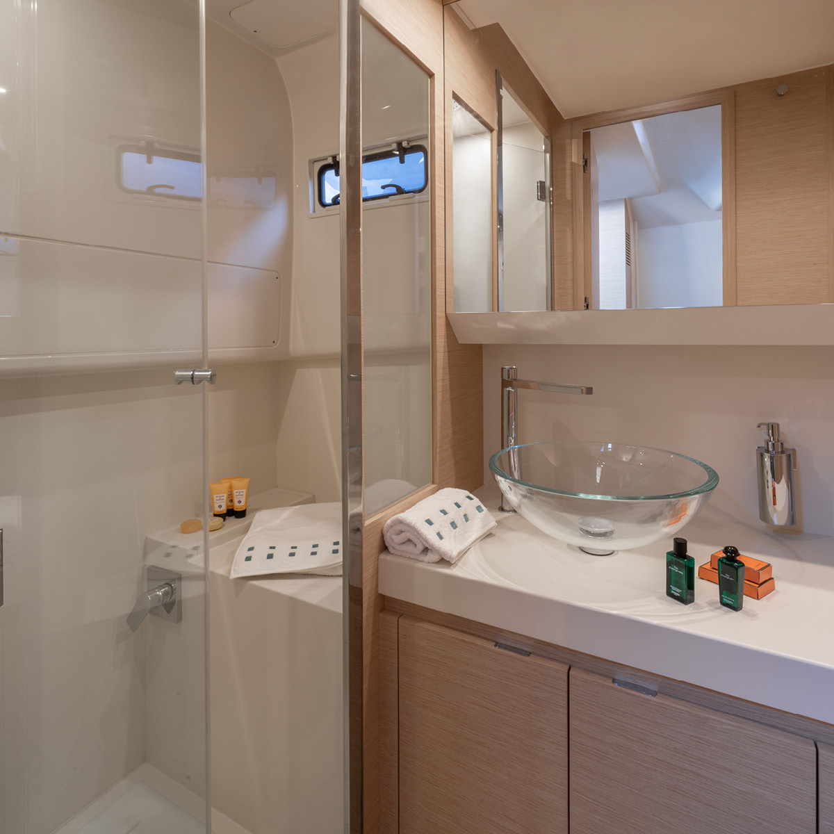 The master cabin offers impressive space, with a bed size that rivals those typically found on much larger yachts